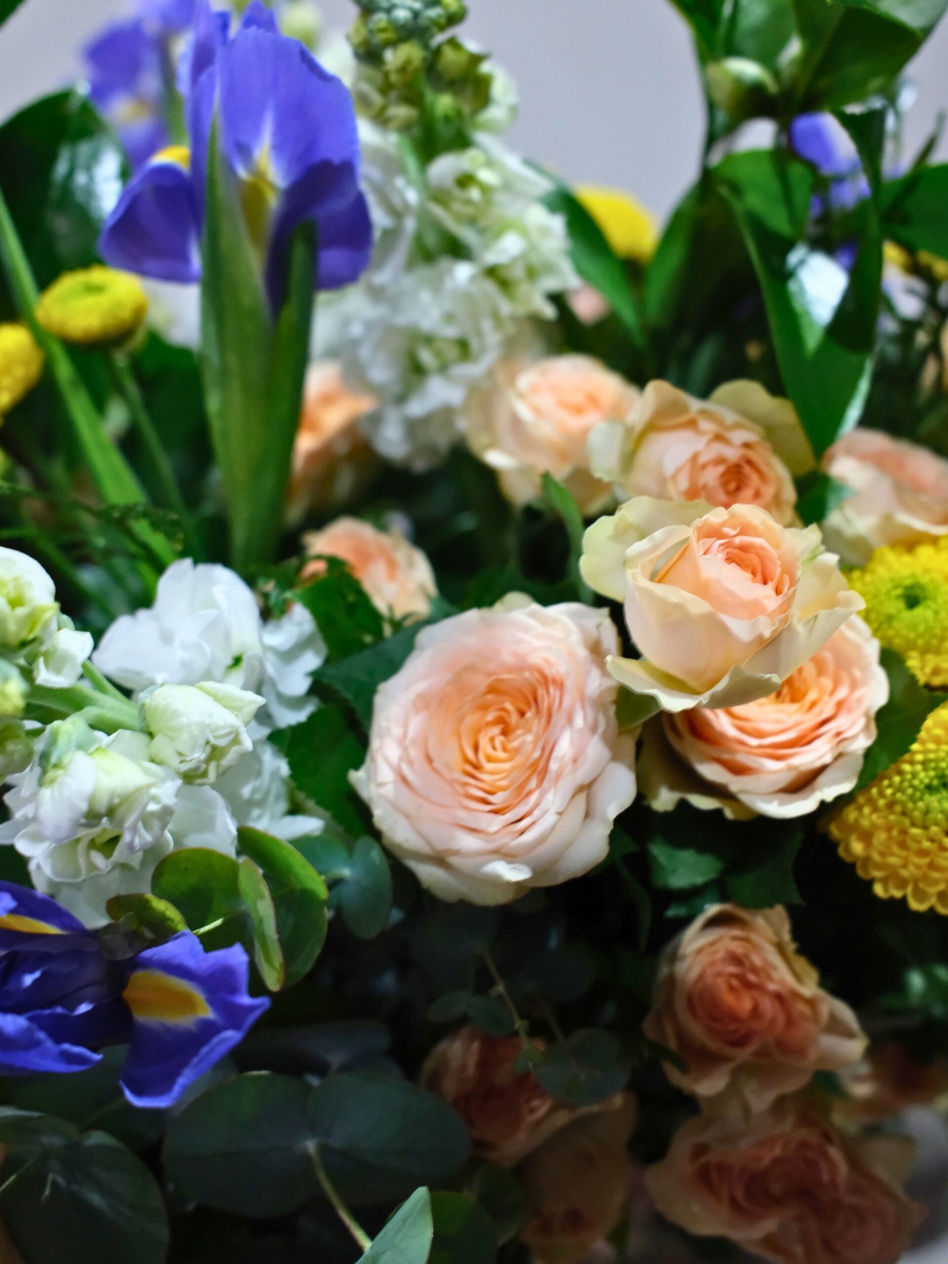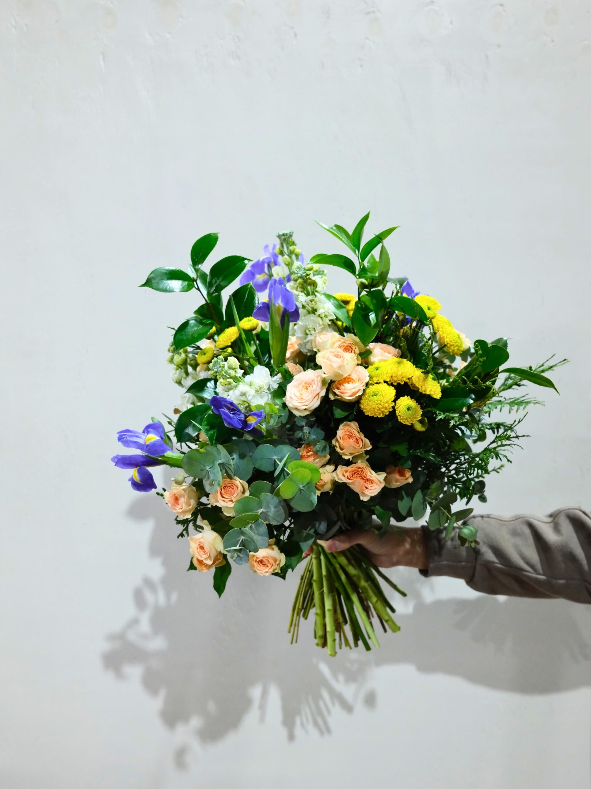 Este ramo es una explosión equilibrada de color y textura: verdes decorativos variados que dan movimiento, rosa spray crema que suaviza, margarita amarilla que ilumina, iris morado que aporta profundidad y alhelí blanco que envuelve con su elegancia delicada.