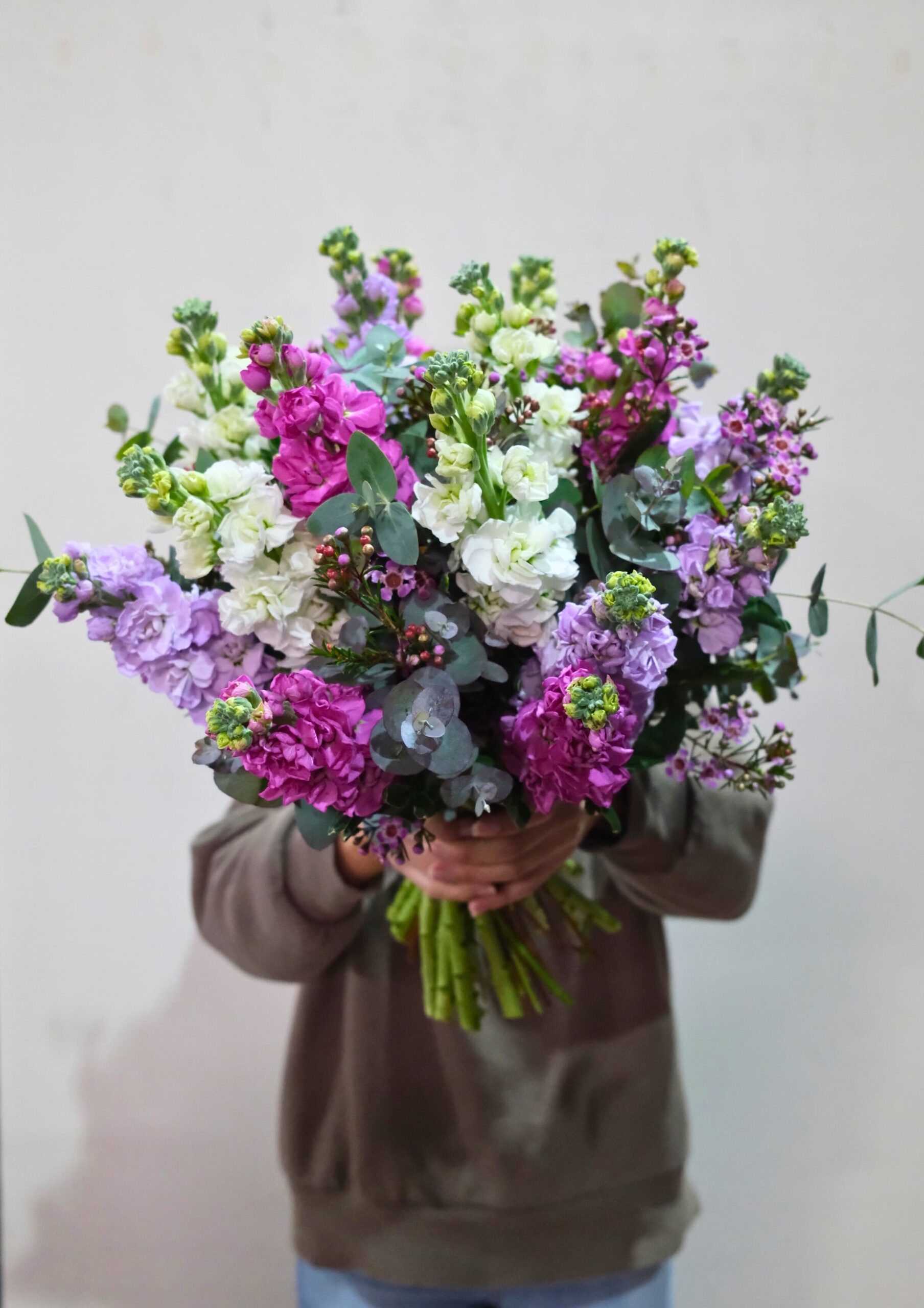 Este ramo de alhelíes en tres colores es una experiencia para los sentidos. Su mayor protagonista no es solo el color, sino su perfume intenso y envolvente, de esos que llenan la estancia y se quedan en la memoria. Cada tono aporta matices distintos, pero juntos crean una armonía delicada y profundamente emocional.